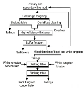 The complete beneficiation process for tungsten slime at the mine site is as follows: After crushing and grinding, the raw ore is separated into coarse minerals and tungsten slime by a classification device. The tungsten slime first enters a high-efficiency thickener for concentration and dewatering to reduce the water content of the slurry to meet the requirements of subsequent separation. The concentrated slurry then enters a desulfurization flotation process to remove sulfide impurities such as pyrite. The desulfurized slurry then enters a centrifugal separation stage (the core separation step). The separated rough concentrate is then further purified by shaking tables to finally produce qualified tungsten concentrate. The tailings from the centrifugal separation are further processed by flotation to recover useful minerals, maximizing resource utilization. The process flow is shown in the diagram below: